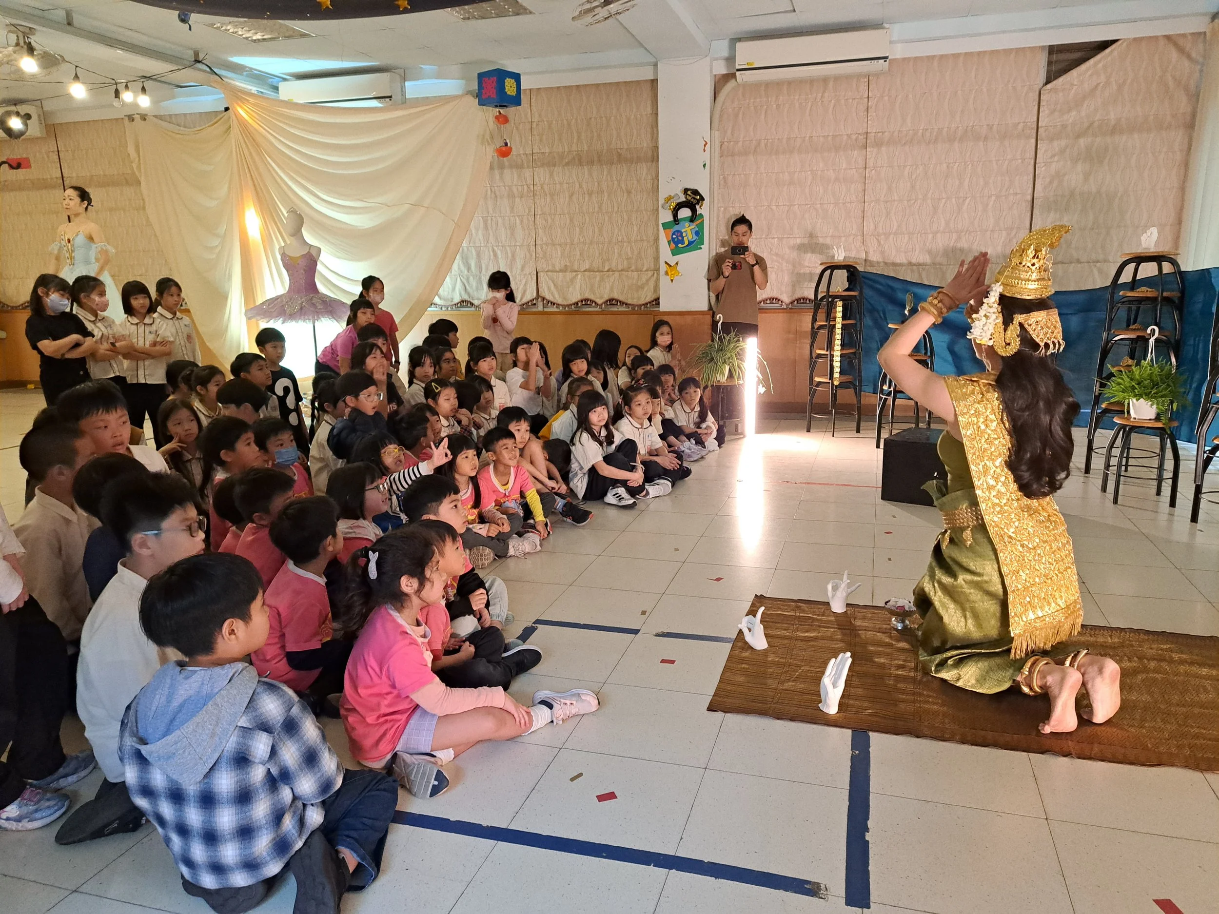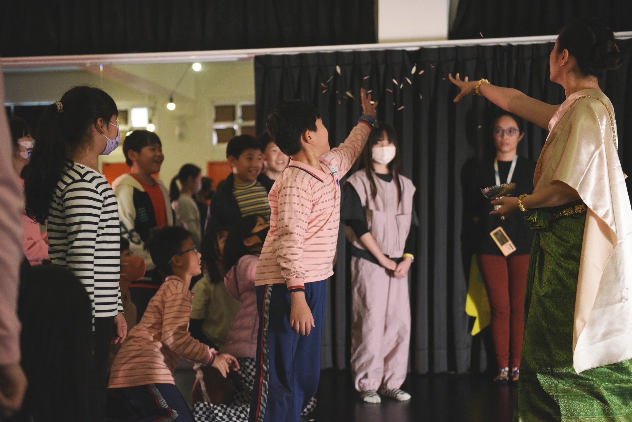 孩子們不僅能欣賞來自不同地域的一小段特色舞蹈,還能親自加入學習:跟著芭蕾舞者認識優雅的芭蕾五個基本位置;向祈福舞舞者學習蘊含佛教輪迴意涵的六個手勢;最後,和非洲舞者一起盡情舞動、吆喝,感受熱情奔放的節奏與能量!